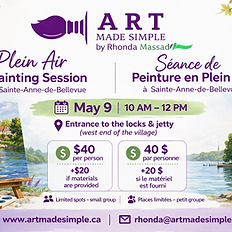 Plein Air Painting – Sainte-Anne-de-Bellevue (To Register - please use Studio Bookings App, Art Made Simple) Join Rhonda for a peaceful outdoor painting session set along the beautiful waterfront of Sainte-Anne-de-Bellevue. This 2-hour guided workshop is designed for all levels, offering personalized instruction in a relaxed, small-group setting. Capture the charm of the lakeside while enjoying fresh air, creativity, and a calming artistic experience. Bring your own materials or opt for a fully supplied kit for an additional fee. 🎨 Plein Air Painting Session – Sainte-Anne-de-Bellevue 🌿 Take a break, slow down, and join me for a peaceful outdoor painting session by the water. This is a wonderful opportunity to enjoy nature, connect with your creativity, and learn in a relaxed, supportive setting. 📅 May 9 | 10 AM – 12 PM 📍 Entrance to the locks & jetty (west end of the village) 💲 $40 per person 🎨 +$20 if materials are provided 👥 Small group (limited spots) All levels are welcome — whether you're a beginner or more experienced, I’ll provide guidance and personalized feedback throughout the session. We’ll be painting a beautiful lakeside scene while enjoying the fresh air and spring atmosphere. To register: Download the Studio Bookings app → Search Art Made Simple → Select Plein Air Painting 🎨 Séance de peinture en plein air – Sainte-Anne-de-Bellevue 🌿 (Enregistrer - Studio Bookings App, Art Made Simple) Prenez une pause et venez profiter d’une séance de peinture relaxante en plein air, au bord de l’eau. Une belle occasion de se reconnecter à la nature et à sa créativité dans une ambiance conviviale. 📅 9 mai | 10 h – 12 h 📍 Entrée des écluses et de la jetée (ouest du village) 💲 40 $ par personne 🎨 +20 $ si le matériel est fourni 👥 Petit groupe (places limitées) Tous les niveaux sont les bienvenus — débutants comme intermédiaires. Je vous accompagnerai avec des conseils personnalisés tout au long de la séance. Nous peindrons un magnifique paysage du lac en profitant de l’air frais du printemps. Pour vous inscrire : Téléchargez l’application Studio Bookings → Recherchez Art Made Simple → Sélectionnez Plein Air Painting